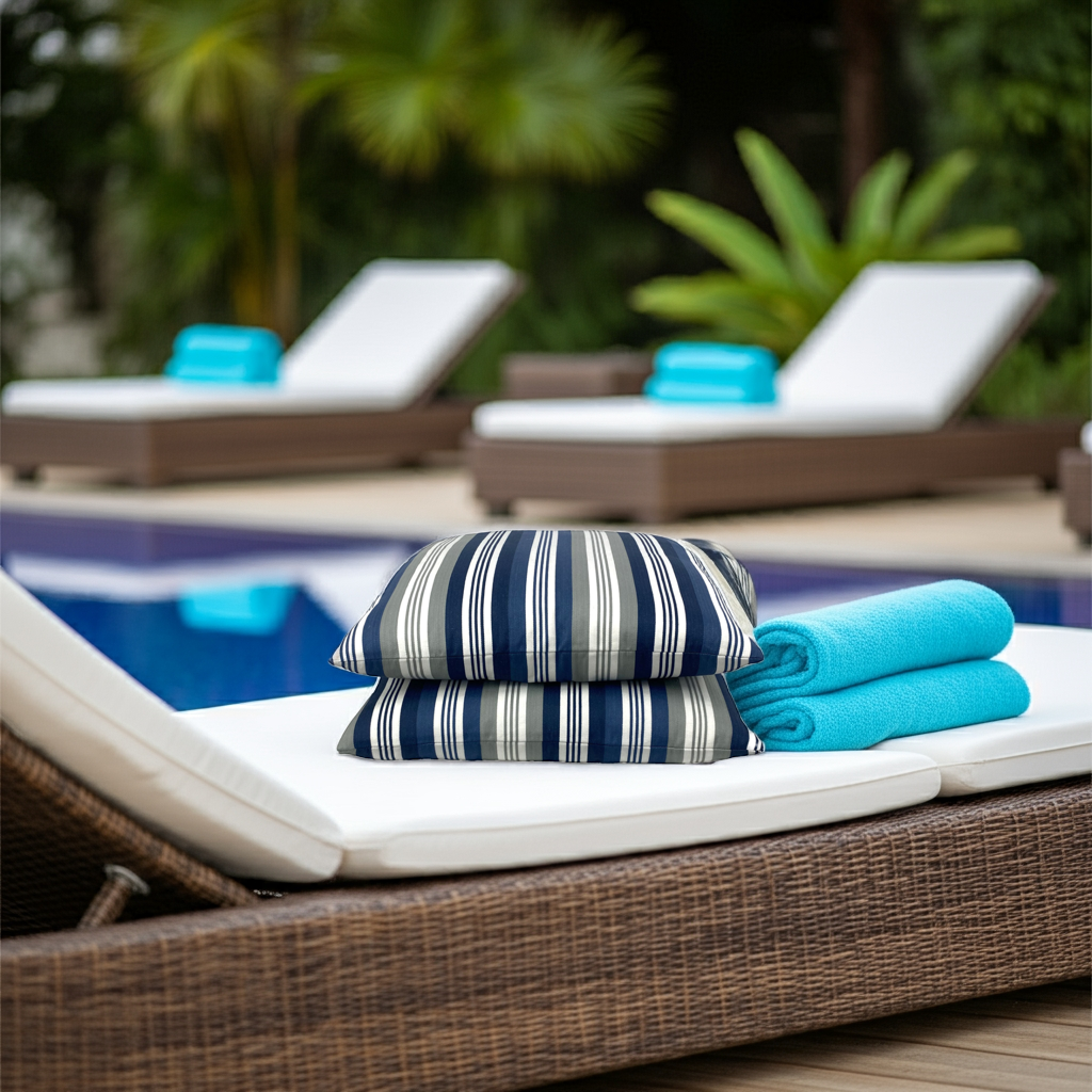 Bold multicolor stripes in indigo, navy, taupe and ivory define this Coastal Impressions fabric. Perfect for the beach house!