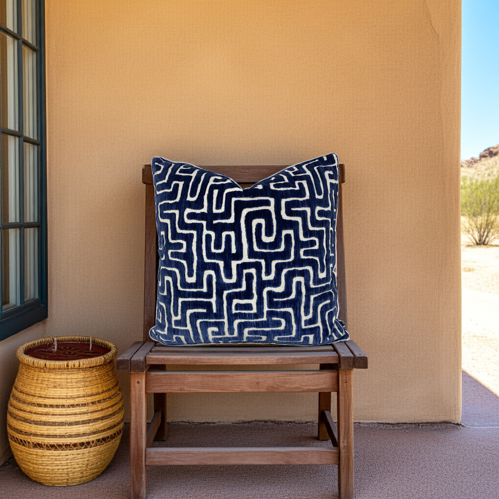Cut velvet is the key to Ebb & Flo’s maze-like pattern. These abstract geometric accent pillows will make a statement in any room you choose to display them.